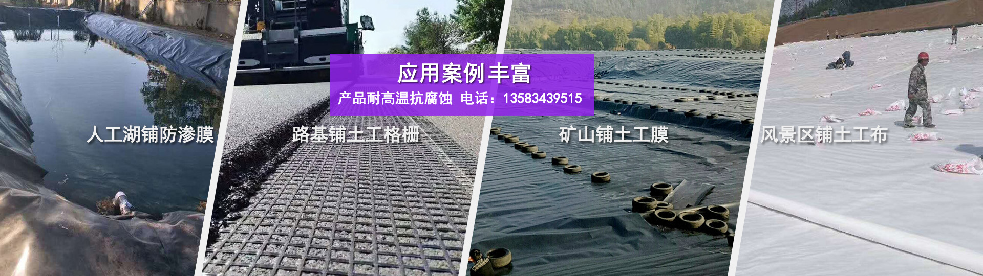 產(chǎn)品廣泛用于: 1.環(huán)保環(huán)衛(wèi)工程(如生活垃圾填埋場防滲、污水處理廠、有毒有害物質(zhì)填埋場、危險(xiǎn)品倉庫、廠房等) 2.水利土木工程(河、湖、水庫、堤壩、堵漏、加固、水渠防滲、護(hù)坡等) 3.市政工程(地鐵、建筑物的地下工程和屋頂蓄水池、屋頂花園防滲、污水管道內(nèi)襯等) 4.園林綠化(人工湖、池塘、高爾夫球場的水塘底襯、護(hù)坡等) 5.石化(化工廠、煉油廠儲(chǔ)油池防滲防污、化學(xué)反應(yīng)池、沉淀池的內(nèi)襯、二次襯層、藥廠基建防滲與隔離) 6.礦業(yè)(洗選池、堆浸池、堆灰場、尾礦壩防滲防污等) 7.交通設(shè)施工(公路的基礎(chǔ)加固、涵洞的防滲) 8.農(nóng)業(yè)(水庫、飲用水池、蓄水池防滲、灌溉系統(tǒng)的防滲) 9.水產(chǎn)養(yǎng)殖業(yè)(魚塘、蝦池的內(nèi)襯等)